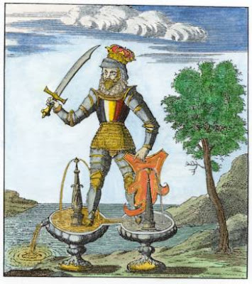 esquerda, um alquimista com um incêndio.